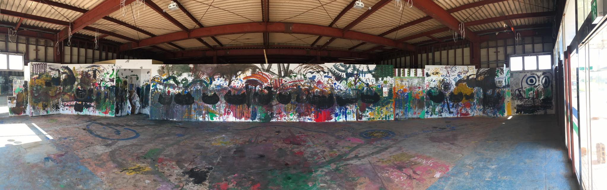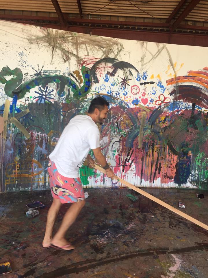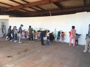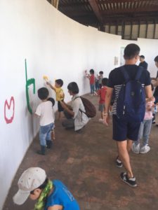 アトリエVIPで、スタッフや、ボランティア、有志の皆様のがんばりによって新たに作られた新しい壁に、子供達と参加型のペインティングをしました。