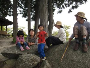 磐座に登り歌い、景色を眺める子供達。